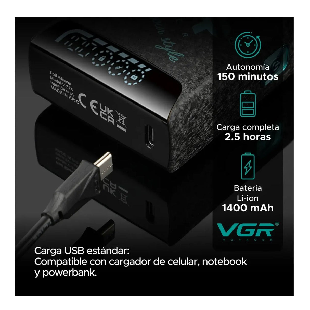 Afeitadora Shaver V-374 2,5 Horas Uso Continuo Inalámbrica