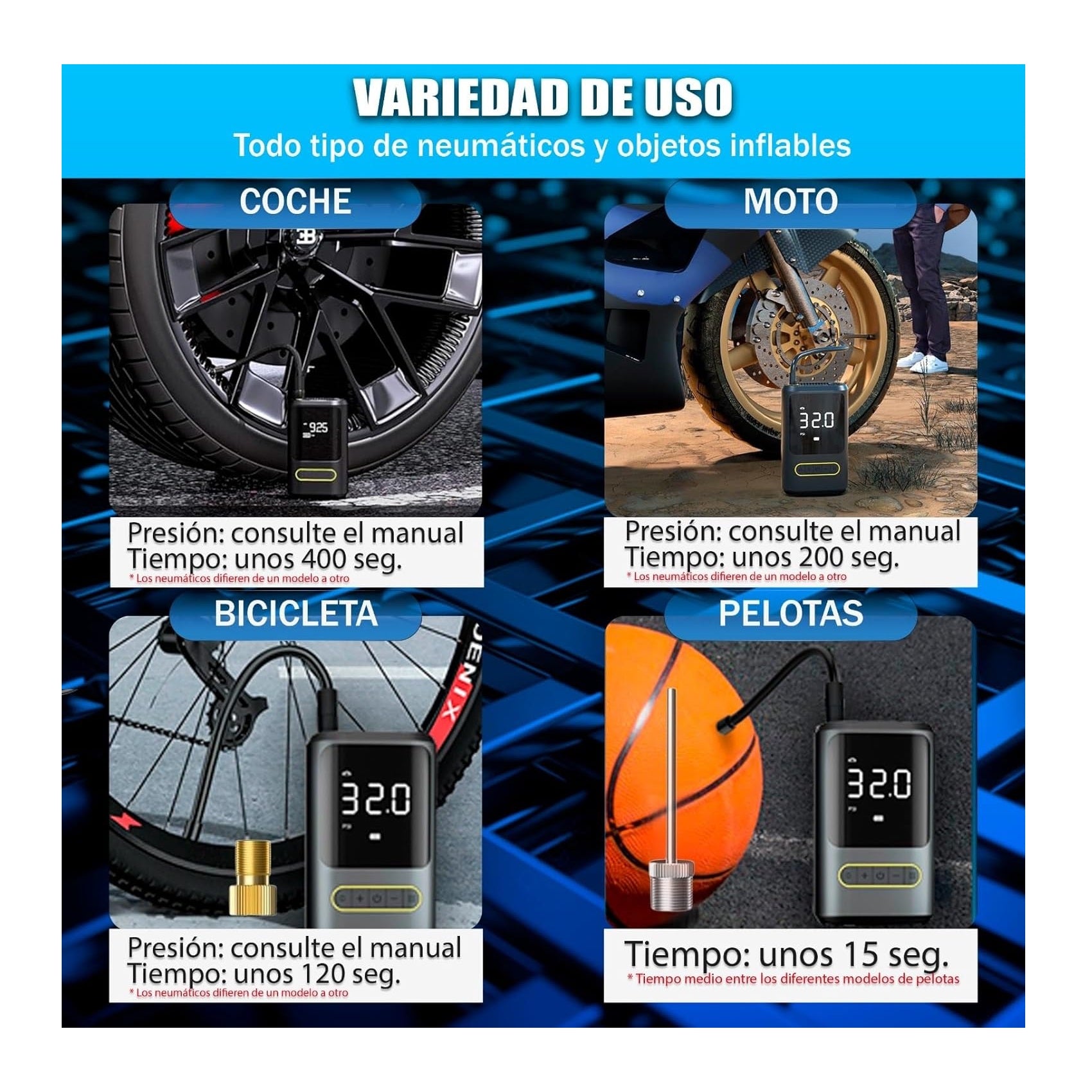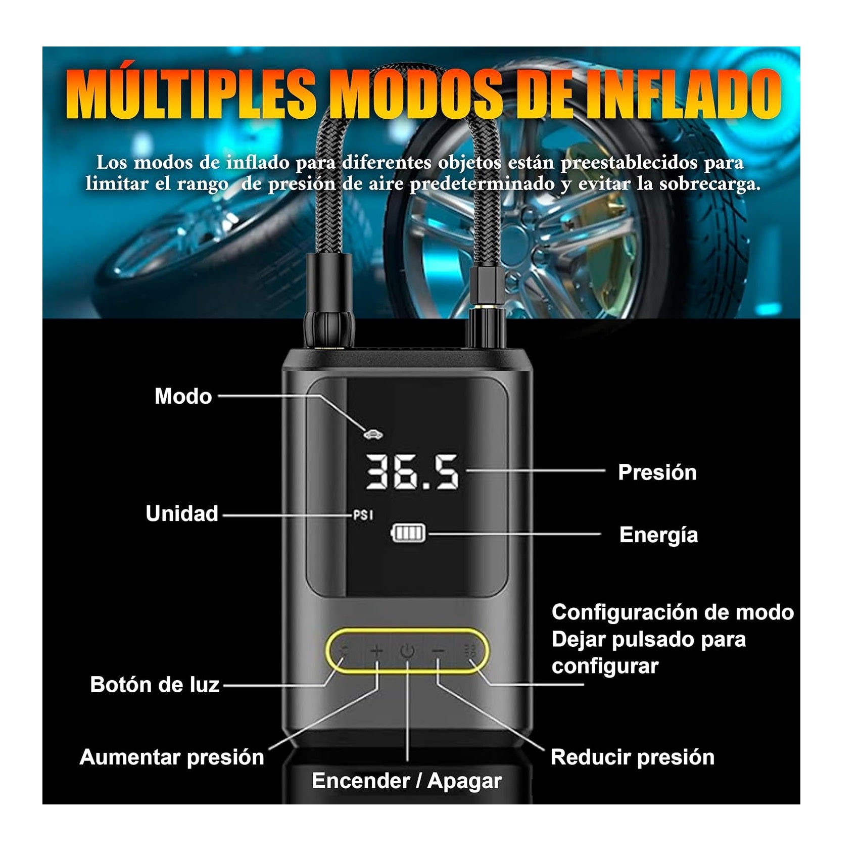 Pantalla LCD extra grande, puedes ver claramente varios indicadores, puedes inflar los neumáticos de coches, motos, bicicletas o balones en pocos minutos, con alta potencia, pantalla LCD, luces LED, alta precisión y larga duración de la batería, etc. Tiene muchas ventajas. Puede usarse como fuente de energía móvil para cargar teléfonos móviles. Tiene cuatro modos para elegir y viene con tres luces.