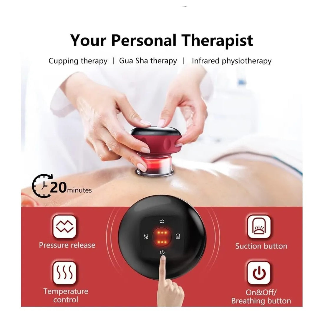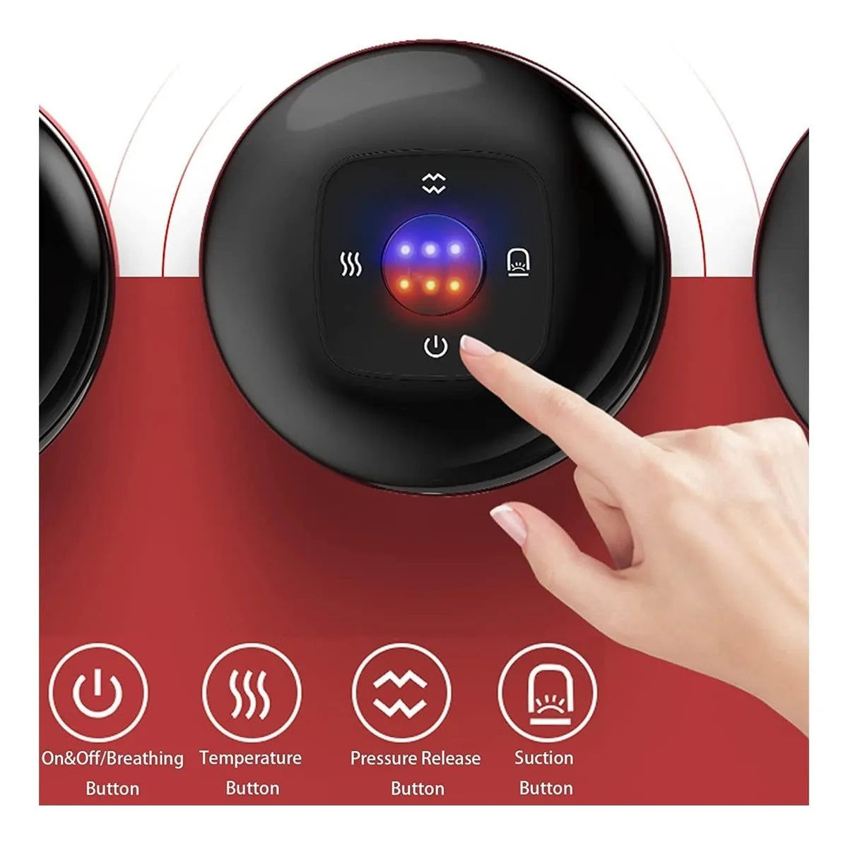 Máquina eléctrica de terapia de ventosas: este versátil instrumento combina ventosas, compresa caliente y masaje, estimulando los músculos profundos y mejorando la circulación sanguínea. El modo de calentamiento descompone eficientemente el ácido láctico, proporcionando alivio de los dolores musculares y acelerando la recuperación después del entrenamiento. 6 niveles de temperatura y succión: con 6 niveles de temperatura y succión, puedes personalizar tu experiencia de ventosa. Disfruta del efecto de relajación a nivel de salón con una temperatura máxima de 122 °F y una fuerza de succión segura de -60 kpa.