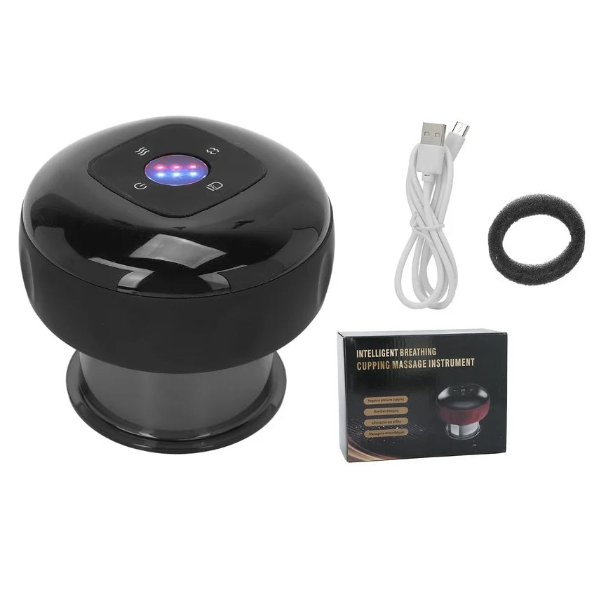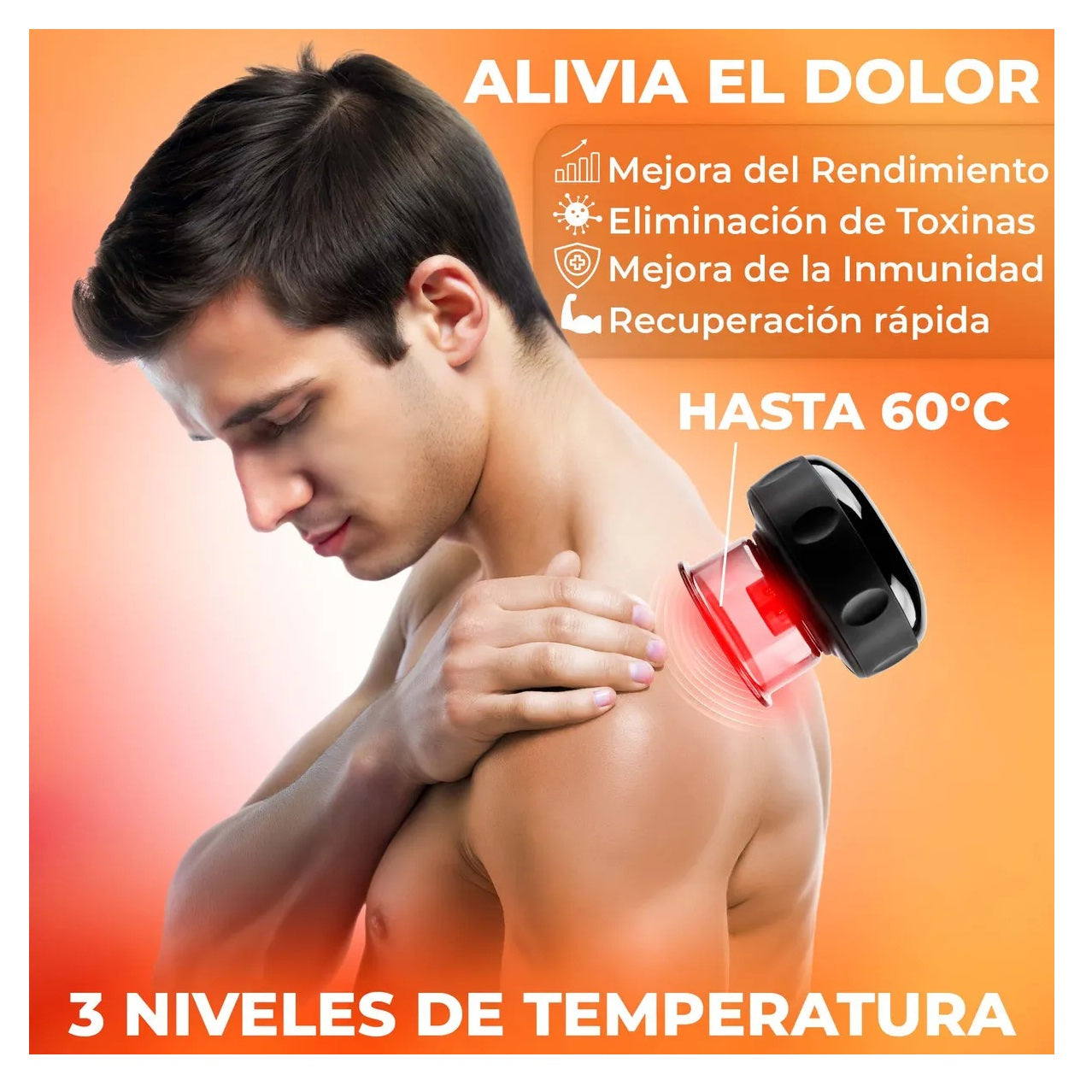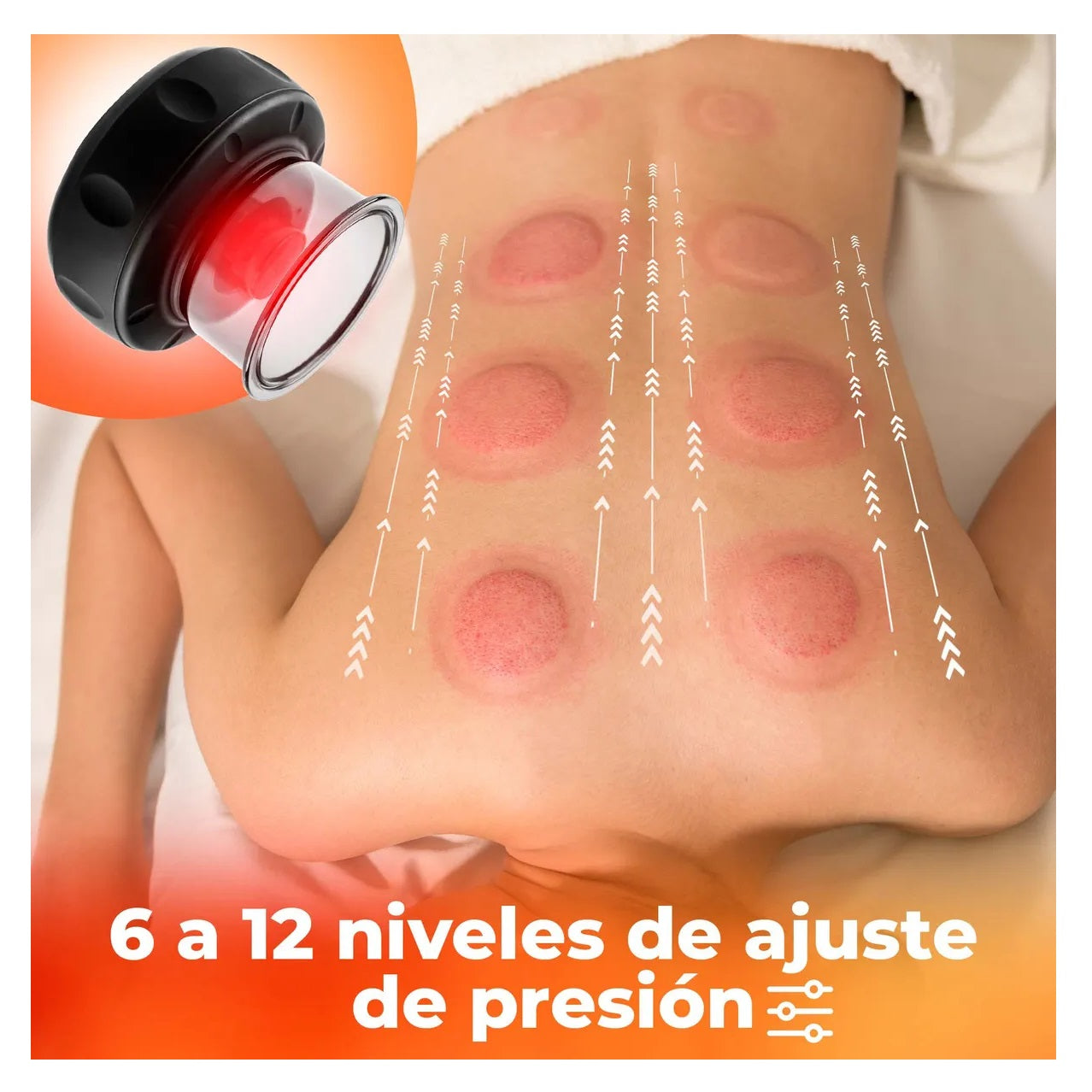 Máquina eléctrica de terapia de ventosas: este versátil instrumento combina ventosas, compresa caliente y masaje, estimulando los músculos profundos y mejorando la circulación sanguínea. El modo de calentamiento descompone eficientemente el ácido láctico, proporcionando alivio de los dolores musculares y acelerando la recuperación después del entrenamiento.