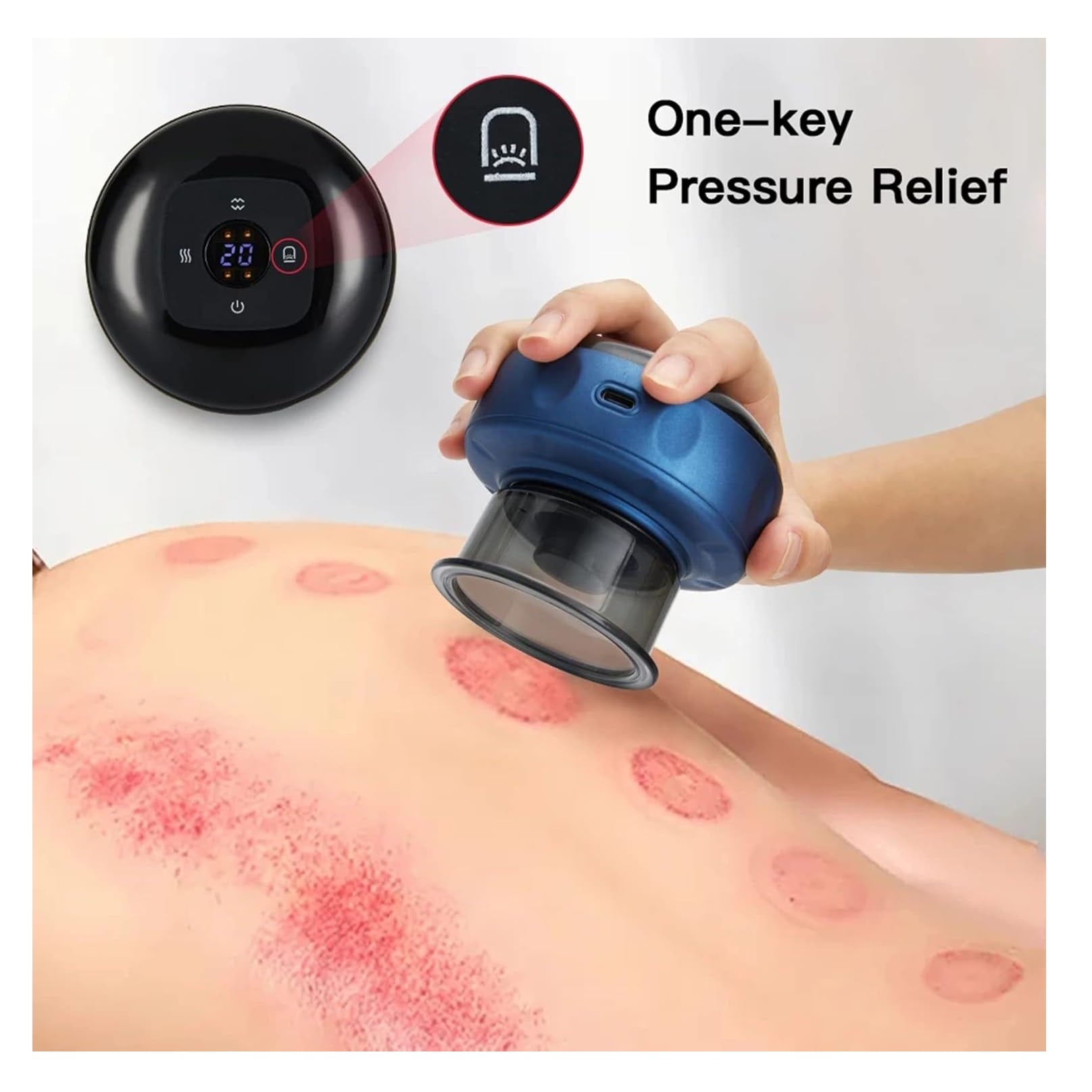 6 niveles de temperatura y succión: con 6 niveles de temperatura y succión, puedes personalizar tu experiencia de ventosa. Disfruta del efecto de relajación a nivel de salón con una temperatura máxima de 122 °F y una fuerza de succión segura de -60 kpa. Consejos: después de ahuecar, pueden aparecer rastros temporales ""similares a moretones"", pero no te preocupes. Es un fenómeno normal de congestión de la piel que se desvanece naturalmente en 3-4 días. Estas marcas realmente ayudan a descomponer el tejido cicatricial, promoviendo una piel más saludable.